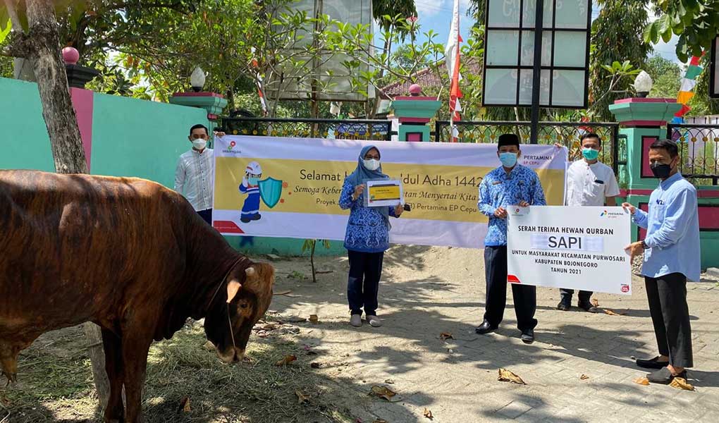 ECONOMIC ZONE - Proyek Jambaran - Tiung Biru (JTB) PT Pertamina EP Cepu (PEPC) yang merupakan Zona 12 Regional 4 Indonesia Timur Subholding Upstream Pertamina, bersama dengan RJJ dan para mitra membagikan puluhan hewan kurban kepada masyarakat. Penyaluran hewan kurban dilakukan dengan cara aman dan tetap menerapkan protokol kesehatan mengingat Idul Adha 1442 H kali ini bertepatan pada masa pemberlakukan PPKM Darurat masa pandemi.