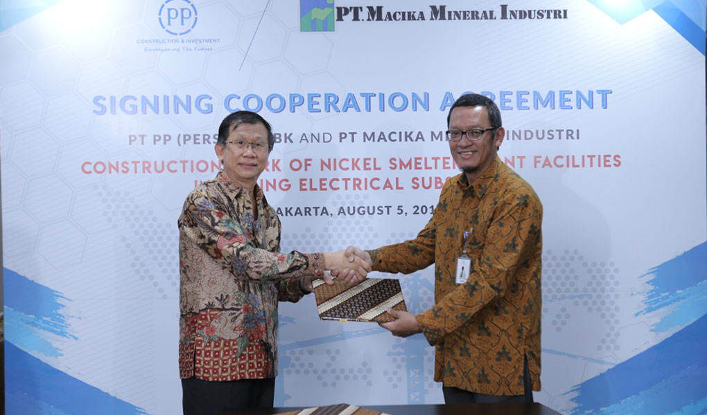 ECONOMIC ZONE - Jakarta, 8 Agustus 2019 – PT PP (Persero) Tbk (“PTPP”) salah satu perusahaan konstruksi dan investasi terkemuka di Indonesia melakukan penandatanganan perjanjian kerjasama terkait pembangunan pabrik peleburan (Nickel Smelter) dengan PT Macika Mineral Industri, Senin (05/08) bertempat di kantor PT Macika Mineral Industri, Jakarta. Kerjasama itu ditandatangani oleh Kepala Divisi EPC Nurlistyo Hadi dan Direktur Utama PT Macika Mineral Industri John Hendarso.
