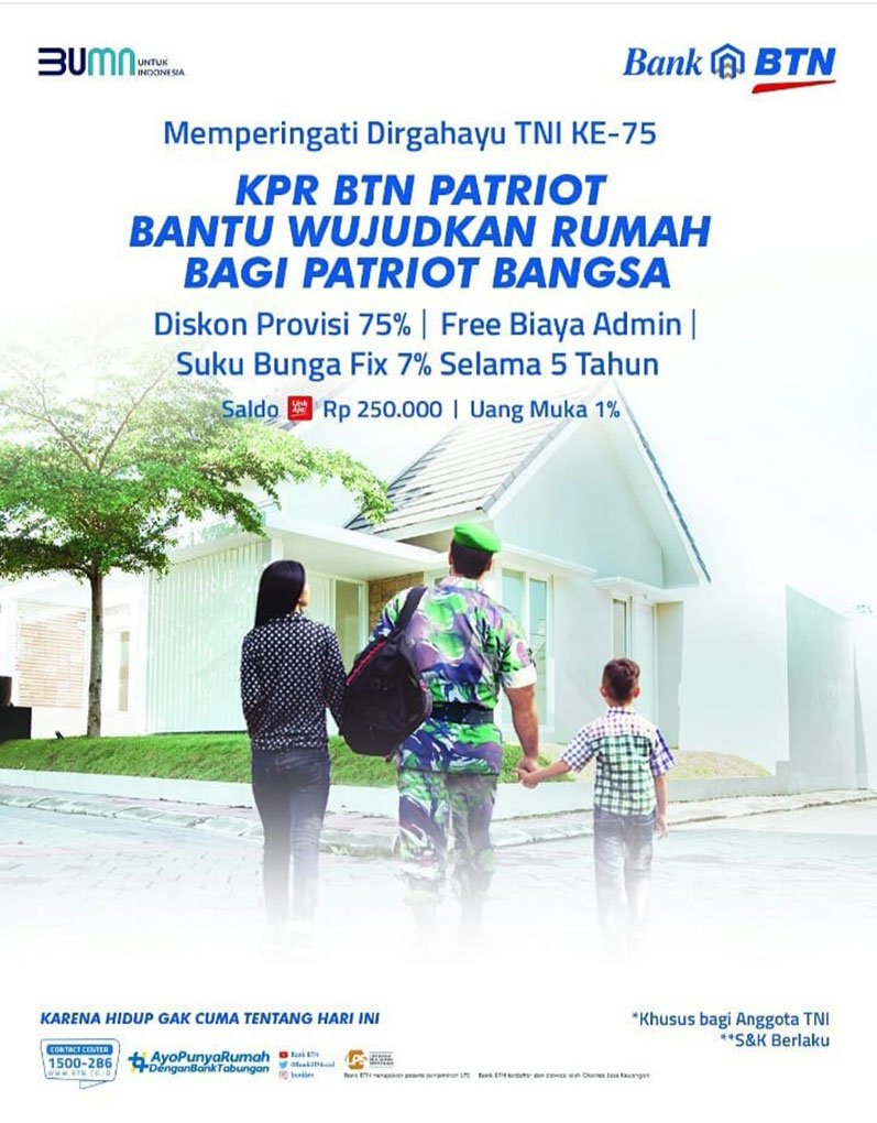 ECONOMIC ZONE - Dalam rangka memeriahkan Hari Ulang Tahun Tentara Nasional Indonesia (TNI) ke-75, PT Bank Tabungan Negara (Persero) Tbk. menawarkan Program Kredit Pemilikan Rumah (KPR) spesial dengan down payment (DP) 1 persen. Program yang bertajuk “KPR BTN Patriot” ini berlaku sejak tanggal 5 Oktober – Desember 2020.