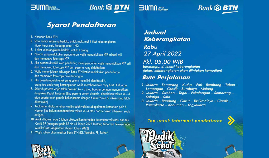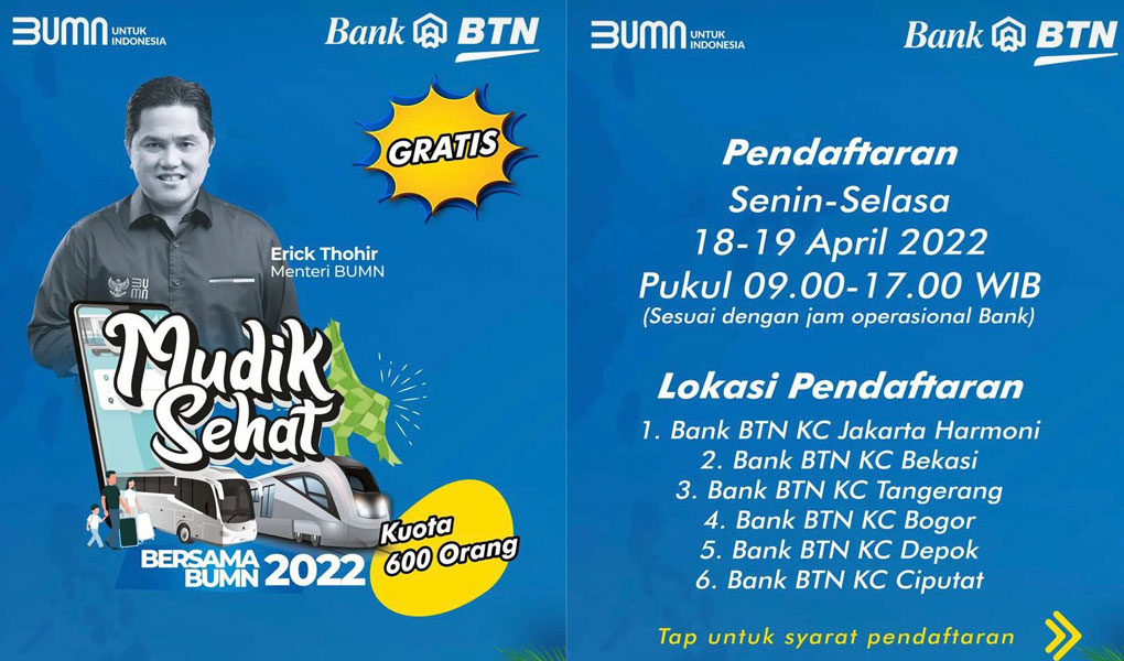 ECONOMIC ZONE - Kegiatan ini merupakan bagian dari Mudik Sehat Bersama BUMN 2022. Pendaftaran Akan dibuka pada 18-19 April 2022 di enam kantor cabang Bank BTN