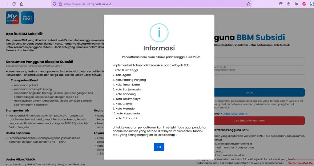 “Kami menyiapkan website MyPertamina yakni https://subsiditepat.mypertamina.id/ yang dibuka pada 1 Juli 2022. Masyarakat yang merasa berhak menggunakan Pertalite dan Solar dapat mendaftarkan datanya melalui website ini, untuk kemudian menunggu apakah kendaraan dan identitasnya terkonfirmasi sebagai pengguna yang terdaftar. Sistem MyPertamina ini akan membantu kami dalam mencocokan data pengguna,” lanjut Alfian.